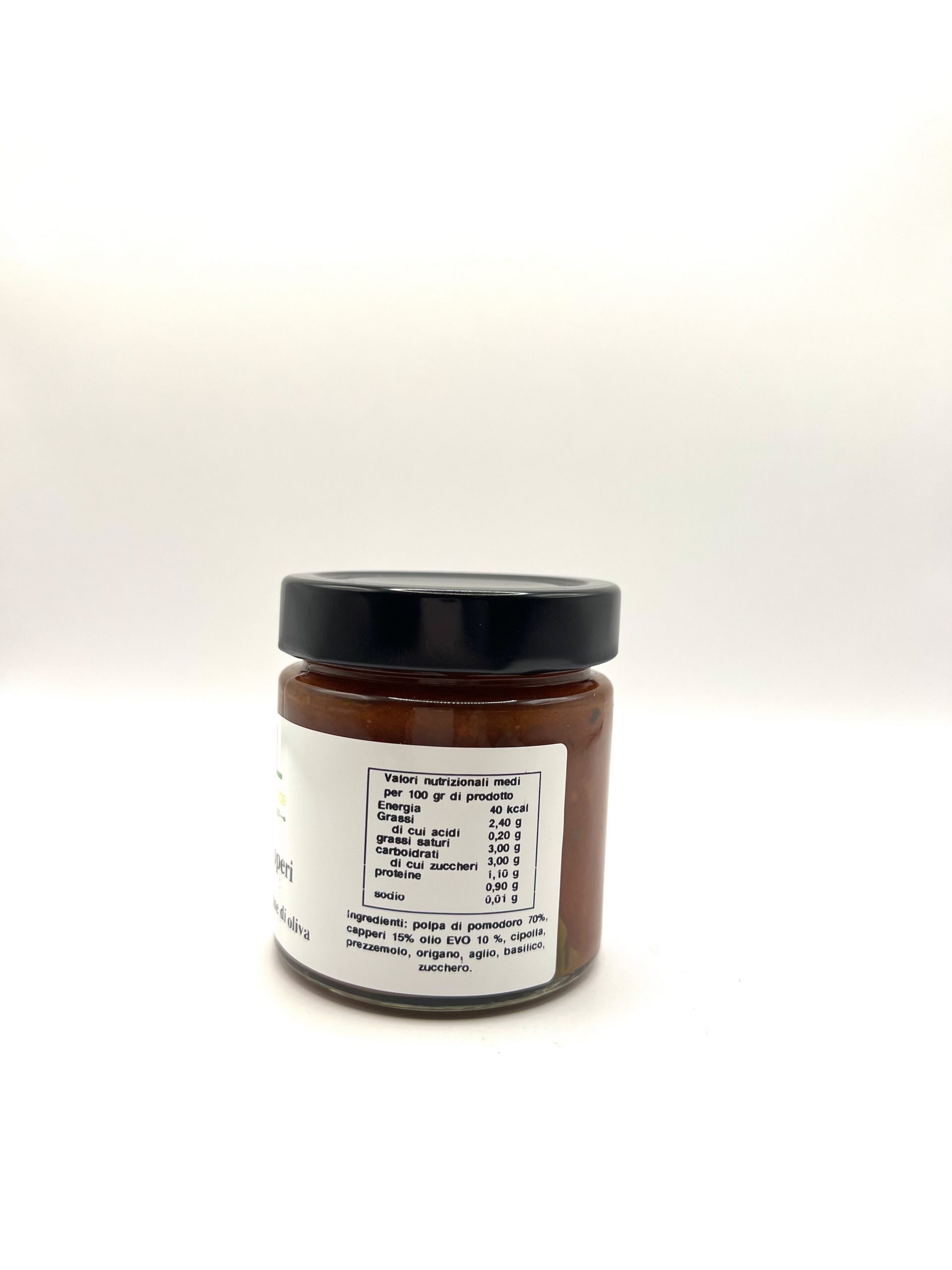 Ingredienti: Polpa di Pomodoro 65% – capperi 20% – olio Evo 10% – cipolla – origano – sale – prezzemolo – aglio – basilico